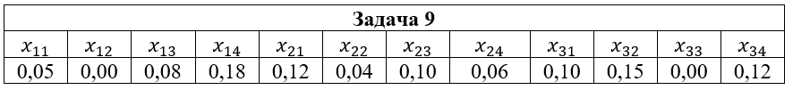 • Задача 9. Дана система двух случайных величин (ξ,η), закон распределения которой задан таблицей, где x1=2; x2=3; x3=5; y1=-1; y2=0; y3=1; y4=2. Найти: 1) законы распределения случайных величин ξ и η; 2) математические ожидания и дисперсии случайных величин ξ и η; 3) коэффициент корреляции rξη; 4) условные распределения Pξ(xi|y2); Pη(yi|x2); 5) условные математические ожидания M(ξ|y2); M(η|x2).