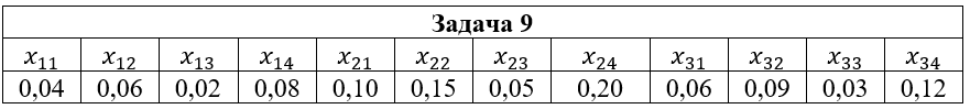 • Задача 9. Дана система двух случайных величин (ξ,η), закон распределения которой задан таблицей, где x1=2; x2=3; x3=5; y1=-1; y2=0; y3=1; y4=2. Найти: 1) законы распределения случайных величин ξ и η; 2) математические ожидания и дисперсии случайных величин ξ и η; 3) коэффициент корреляции rξη; 4) условные распределения Pξ(xi|y2); Pη(yi|x2); 5) условные математические ожидания M(ξ|y2); M(η|x2).