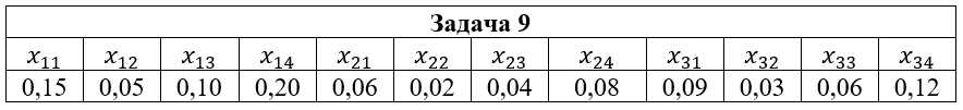 • Задача 9. Дана система двух случайных величин (ξ,η), закон распределения которой задан таблицей, где x1=2; x2=3; x3=5; y1=-1; y2=0; y3=1; y4=2. Найти: 1) законы распределения случайных величин ξ и η; 2) математические ожидания и дисперсии случайных величин ξ и η; 3) коэффициент корреляции rξη; 4) условные распределения Pξ(xi|y2); Pη(yi|x2); 5) условные математические ожидания M(ξ|y2); M(η|x2).
