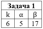 • Задача 1. Одновременно подбрасывают две игральные кости. В вариантах 1-10 найти вероятность того, что сумма выпавших очков: 1) равна k; 2) меньше k+1; 3) больше k-1; 4) заключена в промежутке [α;β]. В вариантах 11-30 найти вероятность того, что произведение выпавших очков: 1) равна k; 2) меньше k+1; 3) больше k-1; 4) заключена в промежутке [α;β].