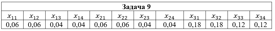 • Задача 9. Дана система двух случайных величин (ξ,η), закон распределения которой задан таблицей, где x1=2; x2=3; x3=5; y1=-1; y2=0; y3=1; y4=2. Найти: 1) законы распределения случайных величин ξ и η; 2) математические ожидания и дисперсии случайных величин ξ и η; 3) коэффициент корреляции rξη; 4) условные распределения Pξ(xi|y2); Pη(yi|x2); 5) условные математические ожидания M(ξ|y2); M(η|x2).
