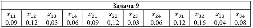 • Задача 9. Дана система двух случайных величин (ξ,η), закон распределения которой задан таблицей, где x1=2; x2=3; x3=5; y1=-1; y2=0; y3=1; y4=2. Найти: 1) законы распределения случайных величин ξ и η; 2) математические ожидания и дисперсии случайных величин ξ и η; 3) коэффициент корреляции rξη; 4) условные распределения Pξ(xi|y2); Pη(yi|x2); 5) условные математические ожидания M(ξ|y2); M(η|x2).