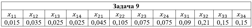 • Задача 9. Дана система двух случайных величин (ξ,η), закон распределения которой задан таблицей, где x1=2; x2=3; x3=5; y1=-1; y2=0; y3=1; y4=2. Найти: 1) законы распределения случайных величин ξ и η; 2) математические ожидания и дисперсии случайных величин ξ и η; 3) коэффициент корреляции rξη; 4) условные распределения Pξ(xi|y2); Pη(yi|x2); 5) условные математические ожидания M(ξ|y2); M(η|x2).