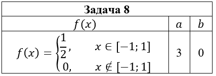 • Задача 8. Дана плотность вероятности f(x) случайной величины ξ. Случайная величина η связана со случайной величиной ξ функциональной зависимостью η=aξ2+b. Найти: 1) математическое ожидание и дисперсию случайной величины η, используя плотность вероятности случайной величины ξ; 2) плотность вероятности случайной величины η и построить ее графики; 3) математическое ожидание и дисперсию случайной величины η, используя найденную плотность вероятности случайной величины η.