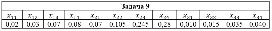 • Задача 9. Дана система двух случайных величин (ξ,η), закон распределения которой задан таблицей, где x1=2; x2=3; x3=5; y1=-1; y2=0; y3=1; y4=2. Найти: 1) законы распределения случайных величин ξ и η; 2) математические ожидания и дисперсии случайных величин ξ и η; 3) коэффициент корреляции rξη; 4) условные распределения Pξ(xi|y2); Pη(yi|x2); 5) условные математические ожидания M(ξ|y2); M(η|x2).