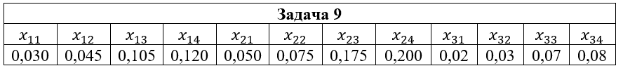 • Задача 9. Дана система двух случайных величин (ξ,η), закон распределения которой задан таблицей, где x1=2; x2=3; x3=5; y1=-1; y2=0; y3=1; y4=2. Найти: 1) законы распределения случайных величин ξ и η; 2) математические ожидания и дисперсии случайных величин ξ и η; 3) коэффициент корреляции rξη; 4) условные распределения Pξ(xi|y2); Pη(yi|x2); 5) условные математические ожидания M(ξ|y2); M(η|x2).