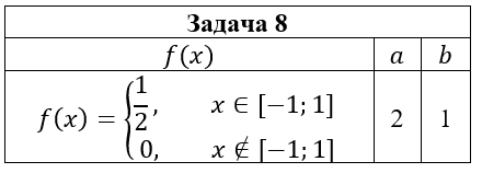 • Задача 8. Дана плотность вероятности f(x) случайной величины ξ. Случайная величина η связана со случайной величиной ξ функциональной зависимостью η=aξ2+b. Найти: 1) математическое ожидание и дисперсию случайной величины η, используя плотность вероятности случайной величины ξ; 2) плотность вероятности случайной величины η и построить ее графики; 3) математическое ожидание и дисперсию случайной величины η, используя найденную плотность вероятности случайной величины η.
