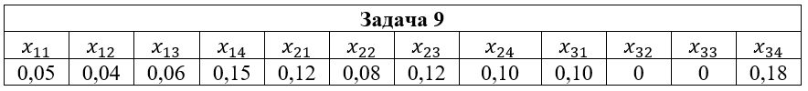 • Задача 9. Дана система двух случайных величин (ξ,η), закон распределения которой задан таблицей, где x1=2; x2=3; x3=5; y1=-1; y2=0; y3=1; y4=2. Найти: 1) законы распределения случайных величин ξ и η; 2) математические ожидания и дисперсии случайных величин ξ и η; 3) коэффициент корреляции rξη; 4) условные распределения Pξ(xi|y2); Pη(yi|x2); 5) условные математические ожидания M(ξ|y2); M(η|x2).
