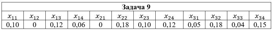 • Задача 9. Дана система двух случайных величин (ξ,η), закон распределения которой задан таблицей, где x1=2; x2=3; x3=5; y1=-1; y2=0; y3=1; y4=2. Найти: 1) законы распределения случайных величин ξ и η; 2) математические ожидания и дисперсии случайных величин ξ и η; 3) коэффициент корреляции rξη; 4) условные распределения Pξ(xi|y2); Pη(yi|x2); 5) условные математические ожидания M(ξ|y2); M(η|x2).