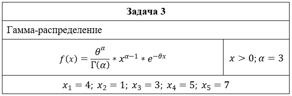 Вариант 5 Задача 1 41,9;44,9;44,7;51,8;43.8;56,9 Задача 2 f(x)=1/(Г(θ))*x^(θ-1)*e^(-x)x>0 Задача 3 Гамма-распределение f(x)=θ^α/Г(α) *x^(α-1)*e^(-θx)x>0;α=3 x_1=4; x_2=1; x_3=3; x_4=5; x_5=7 Задача 4 σ_*=7,5μ_*=47 Задача 6 m=18n=50.