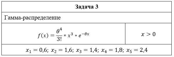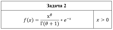 Вариант 19 Задача 1 17;24;81;19;44;75;29;38 Задача 2 f(x)=x^θ/(Г(θ+1))*e^(-x)x>0 Задача 3 Гамма-распределение f(x)=θ^4/3!*x^3*e^(-θx)x>0 x_1=0,6; x_2=1,6; x_3=1,4; x_4=1,8; x_5=2,4 Задача 4 σ_*=24μ_*=48 Задача 6 m=9n=50.