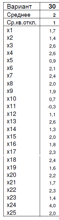 • Задача 4. Выборка Х1,...,Х25 получена из нормального распределения. Найти симметричные доверительные интервалы с уровнем доверия γ=0,95 для среднего значения и дисперсии (используя информацию об известном втором параметре и не используя эту информацию).