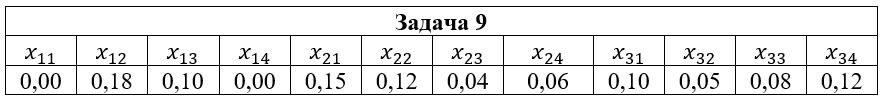 • Задача 9. Дана система двух случайных величин (ξ,η), закон распределения которой задан таблицей, где x1=2; x2=3; x3=5; y1=-1; y2=0; y3=1; y4=2. Найти: 1) законы распределения случайных величин ξ и η; 2) математические ожидания и дисперсии случайных величин ξ и η; 3) коэффициент корреляции rξη; 4) условные распределения Pξ(xi|y2); Pη(yi|x2); 5) условные математические ожидания M(ξ|y2); M(η|x2).