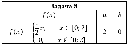 • Задача 8. Дана плотность вероятности f(x) случайной величины ξ. Случайная величина η связана со случайной величиной ξ функциональной зависимостью η=aξ2+b. Найти: 1) математическое ожидание и дисперсию случайной величины η, используя плотность вероятности случайной величины ξ; 2) плотность вероятности случайной величины η и построить ее графики; 3) математическое ожидание и дисперсию случайной величины η, используя найденную плотность вероятности случайной величины η.