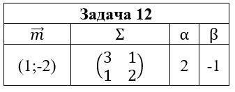 • Задача 12. Случайный вектор (ξ,η) распределен по нормальному закону N(m;Σ). Выписать функцию плотности pξ,η(x,y) и найти: 1) маргинальные плотности pξ(x) и pη(y); 2) условные плотности pξ(x|y) и pη(y|x); 3) коэффициент корреляции ρξ,η; 4) плотность случайной величины ζ=αξ+βη. Построить графики найденных функций и эллипсы рассеяния.