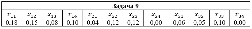 • Задача 9. Дана система двух случайных величин (ξ,η), закон распределения которой задан таблицей, где x1=2; x2=3; x3=5; y1=-1; y2=0; y3=1; y4=2. Найти: 1) законы распределения случайных величин ξ и η; 2) математические ожидания и дисперсии случайных величин ξ и η; 3) коэффициент корреляции rξη; 4) условные распределения Pξ(xi|y2); Pη(yi|x2); 5) условные математические ожидания M(ξ|y2); M(η|x2).