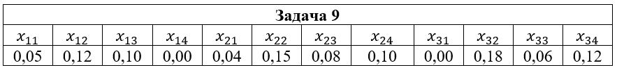 • Задача 9. Дана система двух случайных величин (ξ,η), закон распределения которой задан таблицей, где x1=2; x2=3; x3=5; y1=-1; y2=0; y3=1; y4=2. Найти: 1) законы распределения случайных величин ξ и η; 2) математические ожидания и дисперсии случайных величин ξ и η; 3) коэффициент корреляции rξη; 4) условные распределения Pξ(xi|y2); Pη(yi|x2); 5) условные математические ожидания M(ξ|y2); M(η|x2).