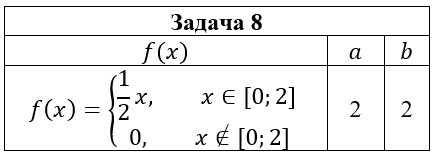 • Задача 8. Дана плотность вероятности f(x) случайной величины ξ. Случайная величина η связана со случайной величиной ξ функциональной зависимостью η=aξ2+b. Найти: 1) математическое ожидание и дисперсию случайной величины η, используя плотность вероятности случайной величины ξ; 2) плотность вероятности случайной величины η и построить ее графики; 3) математическое ожидание и дисперсию случайной величины η, используя найденную плотность вероятности случайной величины η.