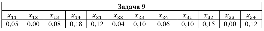 • Задача 9. Дана система двух случайных величин (ξ,η), закон распределения которой задан таблицей, где x1=2; x2=3; x3=5; y1=-1; y2=0; y3=1; y4=2. Найти: 1) законы распределения случайных величин ξ и η; 2) математические ожидания и дисперсии случайных величин ξ и η; 3) коэффициент корреляции rξη; 4) условные распределения Pξ(xi|y2); Pη(yi|x2); 5) условные математические ожидания M(ξ|y2); M(η|x2).
