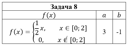 • Задача 8. Дана плотность вероятности f(x) случайной величины ξ. Случайная величина η связана со случайной величиной ξ функциональной зависимостью η=aξ2+b. Найти: 1) математическое ожидание и дисперсию случайной величины η, используя плотность вероятности случайной величины ξ; 2) плотность вероятности случайной величины η и построить ее графики; 3) математическое ожидание и дисперсию случайной величины η, используя найденную плотность вероятности случайной величины η.