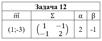 • Задача 12. Случайный вектор (ξ,η) распределен по нормальному закону N(m;Σ). Выписать функцию плотности pξ,η(x,y) и найти: 1) маргинальные плотности pξ(x) и pη(y); 2) условные плотности pξ(x|y) и pη(y|x); 3) коэффициент корреляции ρξ,η; 4) плотность случайной величины ζ=αξ+βη. Построить графики найденных функций и эллипсы рассеяния.