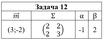 • Задача 12. Случайный вектор (ξ,η) распределен по нормальному закону N(m;Σ). Выписать функцию плотности pξ,η(x,y) и найти: 1) маргинальные плотности pξ(x) и pη(y); 2) условные плотности pξ(x|y) и pη(y|x); 3) коэффициент корреляции ρξ,η; 4) плотность случайной величины ζ=αξ+βη. Построить графики найденных функций и эллипсы рассеяния.