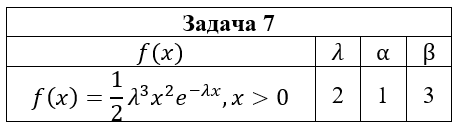 • Задача 7. Непрерывная случайная величина ξ имеет плотность вероятности f(x). Требуется : 1) найти ее функцию распределения F(x) ; 2) построить графики функции распределения F(x) и плотности вероятности f(x); 3) вычислить вероятность попадания случайной величины в интервал (α;β); 4) найти математическое ожидание, дисперсию и среднеквадратическое отклонение случайной величины ξ .