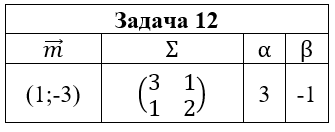 • Задача 12. Случайный вектор (ξ,η) распределен по нормальному закону N(m;Σ). Выписать функцию плотности pξ,η(x,y) и найти: 1) маргинальные плотности pξ(x) и pη(y); 2) условные плотности pξ(x|y) и pη(y|x); 3) коэффициент корреляции ρξ,η; 4) плотность случайной величины ζ=αξ+βη. Построить графики найденных функций и эллипсы рассеяния.