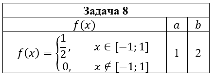 • Задача 8. Дана плотность вероятности f(x) случайной величины ξ. Случайная величина η связана со случайной величиной ξ функциональной зависимостью η=aξ2+b. Найти: 1) математическое ожидание и дисперсию случайной величины η, используя плотность вероятности случайной величины ξ; 2) плотность вероятности случайной величины η и построить ее графики; 3) математическое ожидание и дисперсию случайной величины η, используя найденную плотность вероятности случайной величины η.