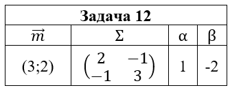 • Задача 12. Случайный вектор (ξ,η) распределен по нормальному закону N(m;Σ). Выписать функцию плотности pξ,η(x,y) и найти: 1) маргинальные плотности pξ(x) и pη(y); 2) условные плотности pξ(x|y) и pη(y|x); 3) коэффициент корреляции ρξ,η; 4) плотность случайной величины ζ=αξ+βη. Построить графики найденных функций и эллипсы рассеяния.