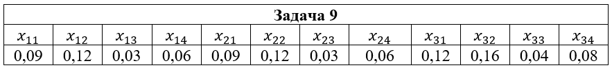 • Задача 9. Дана система двух случайных величин (ξ,η), закон распределения которой задан таблицей, где x1=2; x2=3; x3=5; y1=-1; y2=0; y3=1; y4=2. Найти: 1) законы распределения случайных величин ξ и η; 2) математические ожидания и дисперсии случайных величин ξ и η; 3) коэффициент корреляции rξη; 4) условные распределения Pξ(xi|y2); Pη(yi|x2); 5) условные математические ожидания M(ξ|y2); M(η|x2).