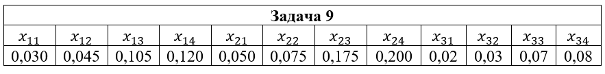 • Задача 9. Дана система двух случайных величин (ξ,η), закон распределения которой задан таблицей, где x1=2; x2=3; x3=5; y1=-1; y2=0; y3=1; y4=2. Найти: 1) законы распределения случайных величин ξ и η; 2) математические ожидания и дисперсии случайных величин ξ и η; 3) коэффициент корреляции rξη; 4) условные распределения Pξ(xi|y2); Pη(yi|x2); 5) условные математические ожидания M(ξ|y2); M(η|x2).