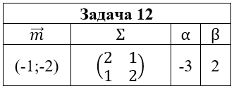 • Задача 12. Случайный вектор (ξ,η) распределен по нормальному закону N(m;Σ). Выписать функцию плотности pξ,η(x,y) и найти: 1) маргинальные плотности pξ(x) и pη(y); 2) условные плотности pξ(x|y) и pη(y|x); 3) коэффициент корреляции ρξ,η; 4) плотность случайной величины ζ=αξ+βη. Построить графики найденных функций и эллипсы рассеяния.