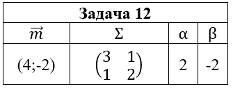 • Задача 12. Случайный вектор (ξ,η) распределен по нормальному закону N(m;Σ). Выписать функцию плотности pξ,η(x,y) и найти: 1) маргинальные плотности pξ(x) и pη(y); 2) условные плотности pξ(x|y) и pη(y|x); 3) коэффициент корреляции ρξ,η; 4) плотность случайной величины ζ=αξ+βη. Построить графики найденных функций и эллипсы рассеяния.
