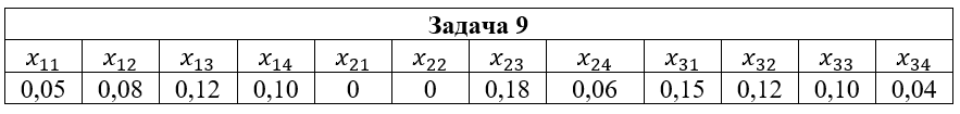 • Задача 9. Дана система двух случайных величин (ξ,η), закон распределения которой задан таблицей, где x1=2; x2=3; x3=5; y1=-1; y2=0; y3=1; y4=2. Найти: 1) законы распределения случайных величин ξ и η; 2) математические ожидания и дисперсии случайных величин ξ и η; 3) коэффициент корреляции rξη; 4) условные распределения Pξ(xi|y2); Pη(yi|x2); 5) условные математические ожидания M(ξ|y2); M(η|x2).