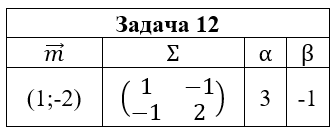 • Задача 12. Случайный вектор (ξ,η) распределен по нормальному закону N(m;Σ). Выписать функцию плотности pξ,η(x,y) и найти: 1) маргинальные плотности pξ(x) и pη(y); 2) условные плотности pξ(x|y) и pη(y|x); 3) коэффициент корреляции ρξ,η; 4) плотность случайной величины ζ=αξ+βη. Построить графики найденных функций и эллипсы рассеяния.