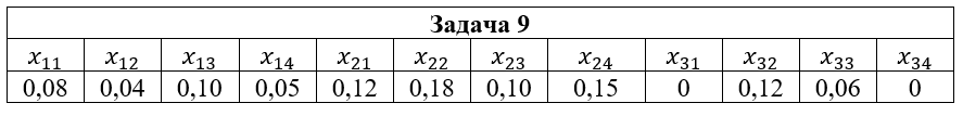 • Задача 9. Дана система двух случайных величин (ξ,η), закон распределения которой задан таблицей, где x1=2; x2=3; x3=5; y1=-1; y2=0; y3=1; y4=2. Найти: 1) законы распределения случайных величин ξ и η; 2) математические ожидания и дисперсии случайных величин ξ и η; 3) коэффициент корреляции rξη; 4) условные распределения Pξ(xi|y2); Pη(yi|x2); 5) условные математические ожидания M(ξ|y2); M(η|x2).