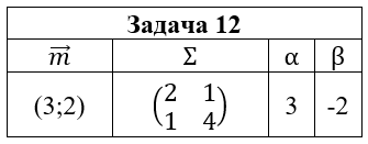 • Задача 12. Случайный вектор (ξ,η) распределен по нормальному закону N(m;Σ). Выписать функцию плотности pξ,η(x,y) и найти: 1) маргинальные плотности pξ(x) и pη(y); 2) условные плотности pξ(x|y) и pη(y|x); 3) коэффициент корреляции ρξ,η; 4) плотность случайной величины ζ=αξ+βη. Построить графики найденных функций и эллипсы рассеяния.