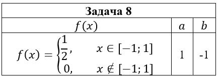• Задача 8. Дана плотность вероятности f(x) случайной величины ξ. Случайная величина η связана со случайной величиной ξ функциональной зависимостью η=aξ2+b. Найти: 1) математическое ожидание и дисперсию случайной величины η, используя плотность вероятности случайной величины ξ; 2) плотность вероятности случайной величины η и построить ее графики; 3) математическое ожидание и дисперсию случайной величины η, используя найденную плотность вероятности случайной величины η.