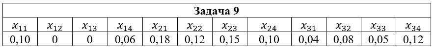 • Задача 9. Дана система двух случайных величин (ξ,η), закон распределения которой задан таблицей, где x1=2; x2=3; x3=5; y1=-1; y2=0; y3=1; y4=2. Найти: 1) законы распределения случайных величин ξ и η; 2) математические ожидания и дисперсии случайных величин ξ и η; 3) коэффициент корреляции rξη; 4) условные распределения Pξ(xi|y2); Pη(yi|x2); 5) условные математические ожидания M(ξ|y2); M(η|x2).