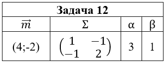 • Задача 12. Случайный вектор (ξ,η) распределен по нормальному закону N(m;Σ). Выписать функцию плотности pξ,η(x,y) и найти: 1) маргинальные плотности pξ(x) и pη(y); 2) условные плотности pξ(x|y) и pη(y|x); 3) коэффициент корреляции ρξ,η; 4) плотность случайной величины ζ=αξ+βη. Построить графики найденных функций и эллипсы рассеяния.