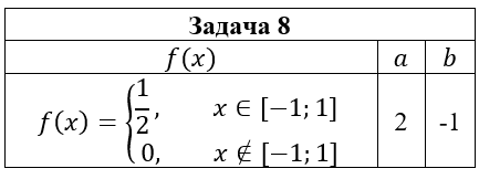 • Задача 8. Дана плотность вероятности f(x) случайной величины ξ. Случайная величина η связана со случайной величиной ξ функциональной зависимостью η=aξ2+b. Найти: 1) математическое ожидание и дисперсию случайной величины η, используя плотность вероятности случайной величины ξ; 2) плотность вероятности случайной величины η и построить ее графики; 3) математическое ожидание и дисперсию случайной величины η, используя найденную плотность вероятности случайной величины η.