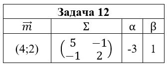 • Задача 12. Случайный вектор (ξ,η) распределен по нормальному закону N(m;Σ). Выписать функцию плотности pξ,η(x,y) и найти: 1) маргинальные плотности pξ(x) и pη(y); 2) условные плотности pξ(x|y) и pη(y|x); 3) коэффициент корреляции ρξ,η; 4) плотность случайной величины ζ=αξ+βη. Построить графики найденных функций и эллипсы рассеяния.
