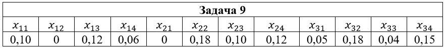 • Задача 9. Дана система двух случайных величин (ξ,η), закон распределения которой задан таблицей, где x1=2; x2=3; x3=5; y1=-1; y2=0; y3=1; y4=2. Найти: 1) законы распределения случайных величин ξ и η; 2) математические ожидания и дисперсии случайных величин ξ и η; 3) коэффициент корреляции rξη; 4) условные распределения Pξ(xi|y2); Pη(yi|x2); 5) условные математические ожидания M(ξ|y2); M(η|x2).