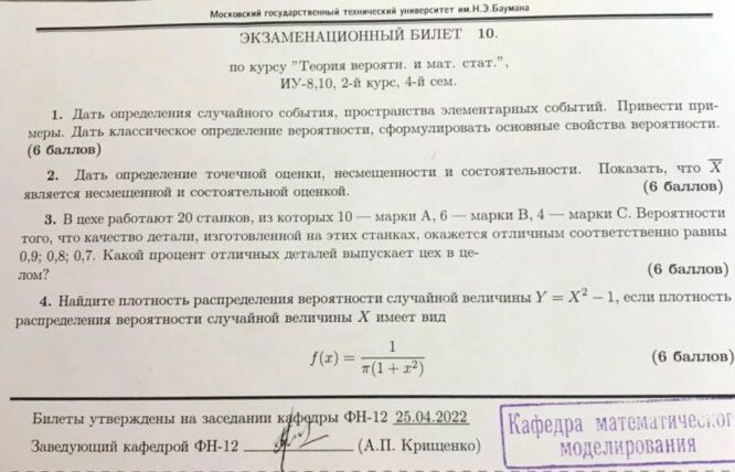 Для студентов МГТУ им. Н.Э.Баумана по предмету Теория вероятностей и математическая статистика (ТВиМС)16 билетов к экзамену (2022 + 2021)16 билетов к экзамену (2022 + 2021)