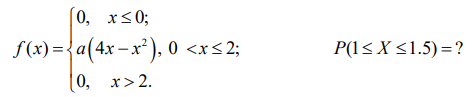 Дифференциальная функция распределения (плотность распределения) f (х) случайной величины X задана выражением, зависящим от параметра. 1. Найти значение параметра а 2. Найти интегральную функцию распределения F(x) и построить графики f(x) и F(x); 3. Найти математическое ожидание, дисперсию и среднее квадратическое отклонение данной случайной величины; 4. Вычислить вероятность Р попадания случайной величины X на заданный интервал