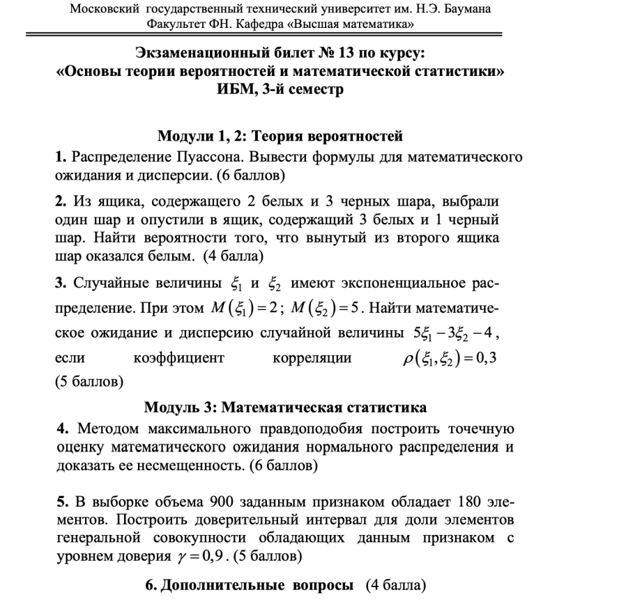 Для студентов МГТУ им. Н.Э.Баумана по предмету Теория вероятностей и математическая статистика (ТВиМС)Билеты + Ответы к ЭкзаменуБилеты + Ответы к Экзамену