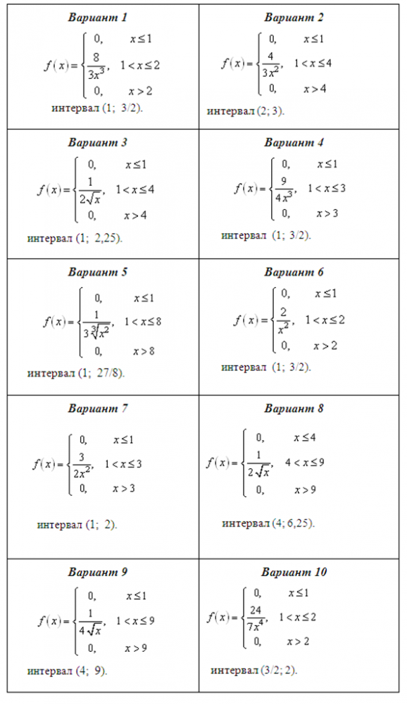 Задание 2. Задана плотность распределения вероятностей f(х) случайной величины Х. Найти математическое ожидание и дисперсию случайной величины, определить вероятность попадания случайной величины в указанный интервал. (вариант 10)