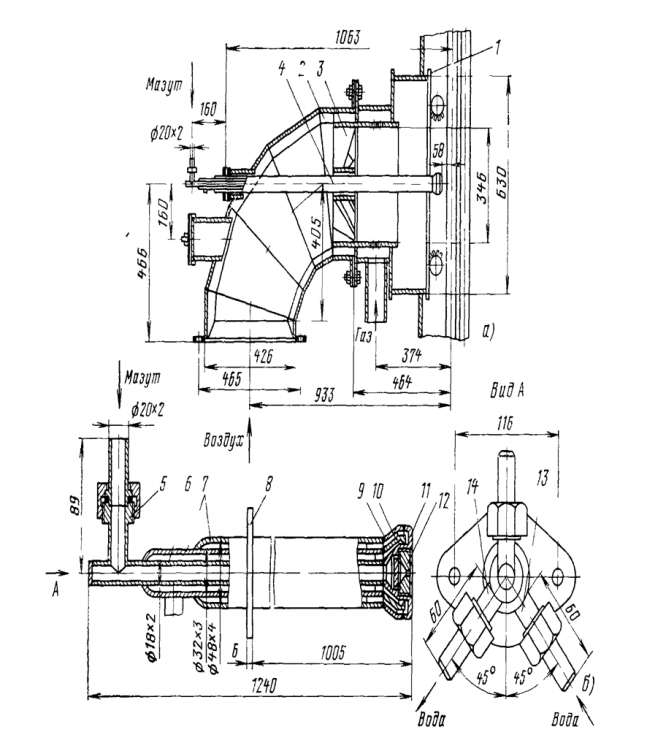 а-горелка в сборе; б-мазутная форсунка с водяным охлаждением,1- рама горелки,2-короб горелки,3-регистр,4-мазутная форсунка,5-штуцер подачи мазута,6-топливоподающая труба,7-водяная рубашка,8-фланец,9-конус наружний,10-конус средний,11-головка,12-завихритель,13 и 14-штуцер подвода и отвода воды