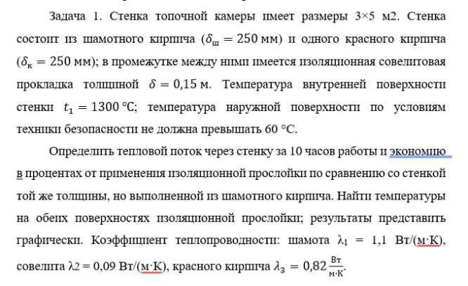 Тема. Теплопроводность и теплопередача Задача 1. Стенка топочной камеры имеет размеры 3×5 м2. Стенка состоит из шамотного кирпича (δ_ш=250 мм) и одного красного кирпича (δ_к=250 мм); в промежутке между ними имеется изоляционная совелитовая прокладка